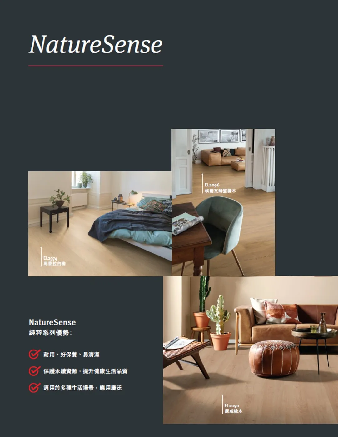 為理想生活增添靈感創意與舒適感,採用可再生木材製成,提供多種美觀的花色與規格可選。表面抗紫外線、抗刮耐磨、耐衝擊,適合各種日常使用場景,且清潔及維護保養簡便。